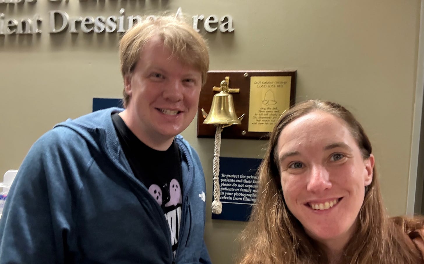 My wife and I in the waiting room - I will ring the bell when I am officially done with treatment
